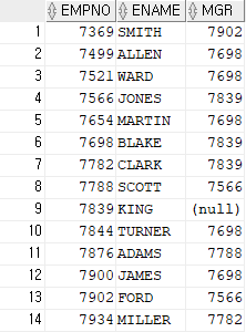 SELECT EMPNO,ENAME,MGR FROM EMP;