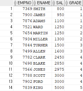 SELECT EMPNO,ENAME,SAL,GRADE FROM EMP, SALGRADE WHERE SAL BETWEEN LOSAL AND HISAL;