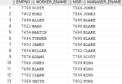 SELECT WORKER.EMPNO,WORKER.ENAME WORKER_ENAME,WORKER.MGR,MANAGER.ENAME MANAGER_ENAME