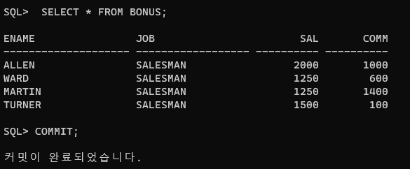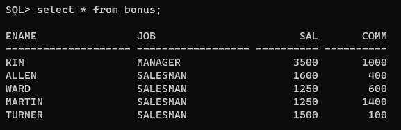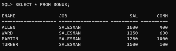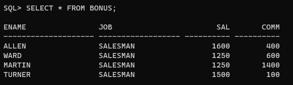 SELECT * FROM BONUS; --테이블 확인