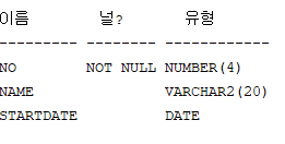 예시) MANAGER 테이블 생성 - 사원번호(숫자형),사원이름(문자형),입사일(날짜형-기본값:현재),급여(숫자형-기본값:1000)