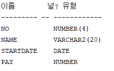 CREATE TABLE SAWON1 (NO NUMBER(4),NAME VARCHAR2(20),PAY NUMBER);
