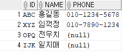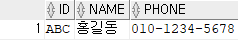 INSERT INTO USER4 VALUES('ABC','홍길동','010-1234-5678');