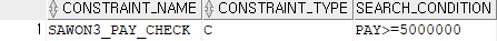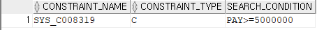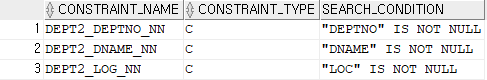 SELECT CONSTRAINT_NAME,CONSTRAINT_TYPE,SEARCH_CONDITION FROM USER_CONSTRAINTS WHERE TABLE_NAME='DEPT2';