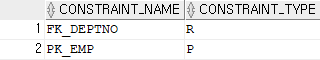 SELECT CONSTRAINT_NAME,CONSTRAINT_TYPE FROM USER_CONSTRAINTS WHERE TABLE_NAME='EMP';