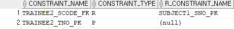 SELECT CONSTRAINT_NAME,CONSTRAINT_TYPE,R_CONSTRAINT_NAME FROM USER_CONSTRAINTS WHERE TABLE_NAME='TRAINEE2';