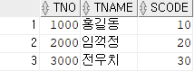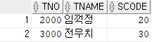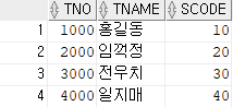 ,TNAME VARCHAR2(20),SCODE NUMBER(2));