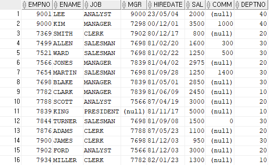 >> EMP_COPY 테이블에 행이 삽입되는 것과 같다. 생략된 컬럼에는 컬럼의 기본값이 저장된다.