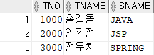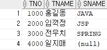 SELECT TNO,TNAME,SNAME FROM TRAINEE1 JOIN SUBJECT1 ON SCODE=SNO; --[일지매] 미검색