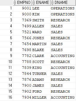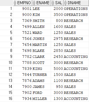 SELECT * FROM (SELECT EMPNO,ENAME,SAL,DNAME FROM EMP JOIN DEPT ON EMP.DEPTNO=DEPT.DEPTNO);