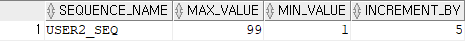 ALTER SEQUENCE USER2_SEQ MAXVALUE 99 INCREMENT BY 5;