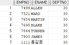 INSERT INTO EMP_VIEW30 VALUES(1111,'홍길동',30);