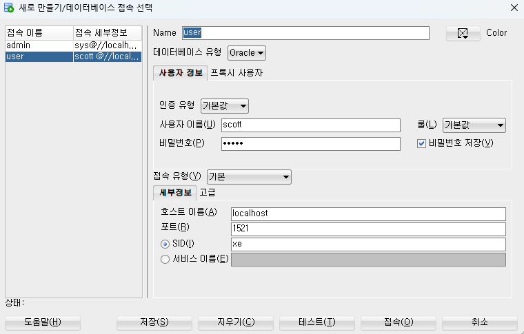 String url="jdbc:oracle:thin:@localhost:1521:xe"; //1521포트에 접속해 xe 데이터베이스 사용