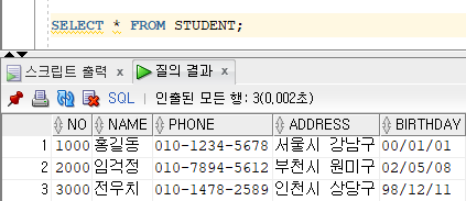 STUDENT 테이블 - 학번(숫자형-PRIMARY KEY),이름(문자형),전화번호(문자형),주소(문자형),생년월일(날짜형)