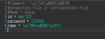 - Properties 파일에서는 영문자,숫자,일부 특수문자를 제외한 나머지 문자는 유니코드로 변환되어 처리된다.