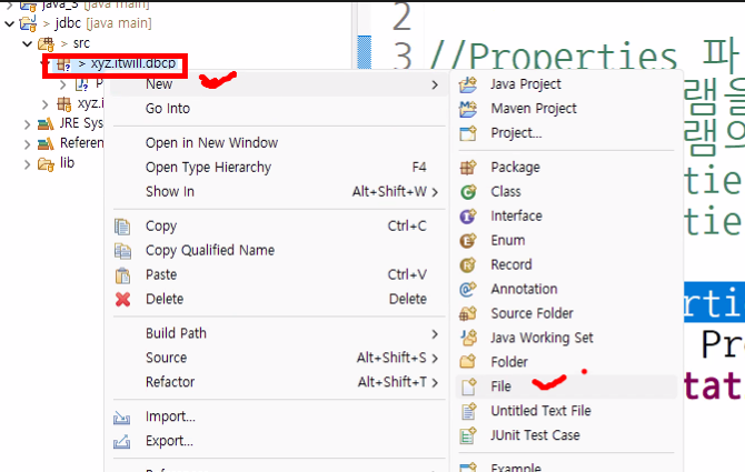 : 패키지 우클릭 >> New >> File >> ~.properties 로 파일 생성