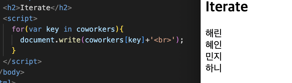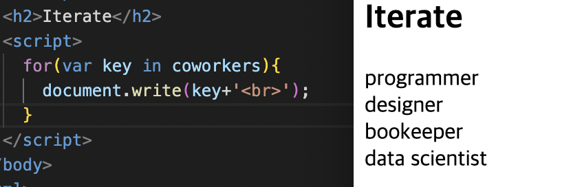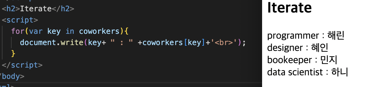 coworkers에 있는 key를 하나하나 꺼내 {}에 있는 코드를 실행해주는 명령