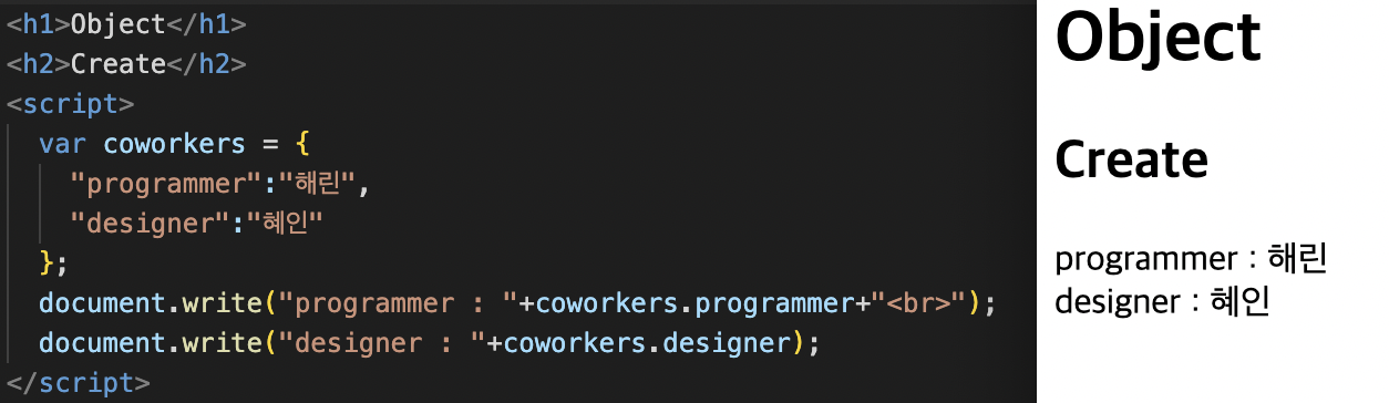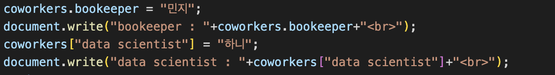 -> coworkers 라는 객체에 해린,민지 라는 정보를 각각 programmer, designer라는 딱지를 붙여 저장한 것.
