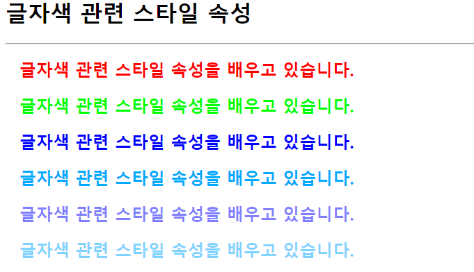 <div class="color6">글자색 관련 스타일 속성을 배우고 있습니다.</div>