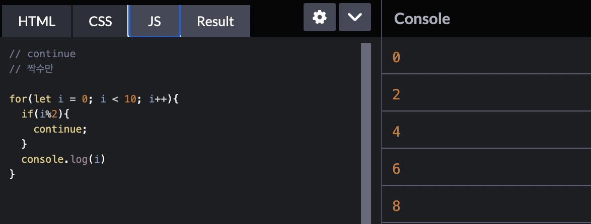 continue : 코드 실행을 멈추고 다음 명령문을 실행